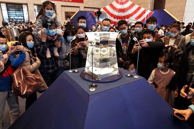 观众参观展出的“月球样品001号”