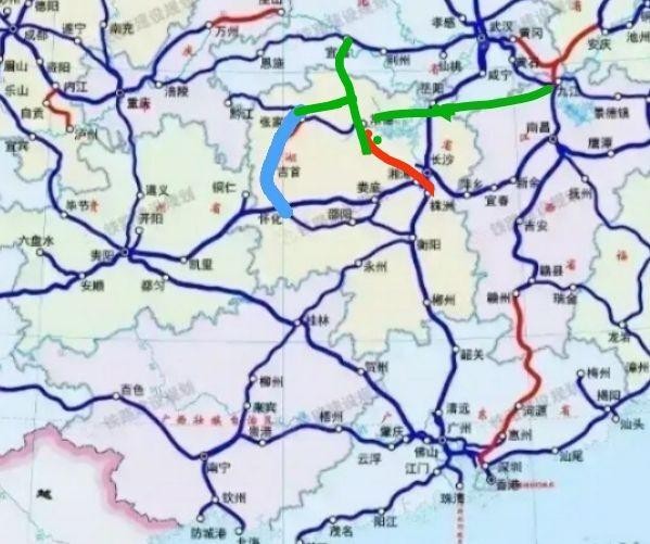 目前常德辖区只有通往张家界的高铁线路,连省会长沙的高铁都没有开通,交通非常的不便,带到所有高铁线路建设完成后,常德市将可以形成4个方向的高铁线路。从下图可以看出常德市的大致高铁方向,注意想看详细的路线要看国家发布的,下图仅仅表示大致方向,不代表实际为位置,想看详细的规划图(蓝色表示已经开通的,红色表示在建设的的,绿色表示规划的)