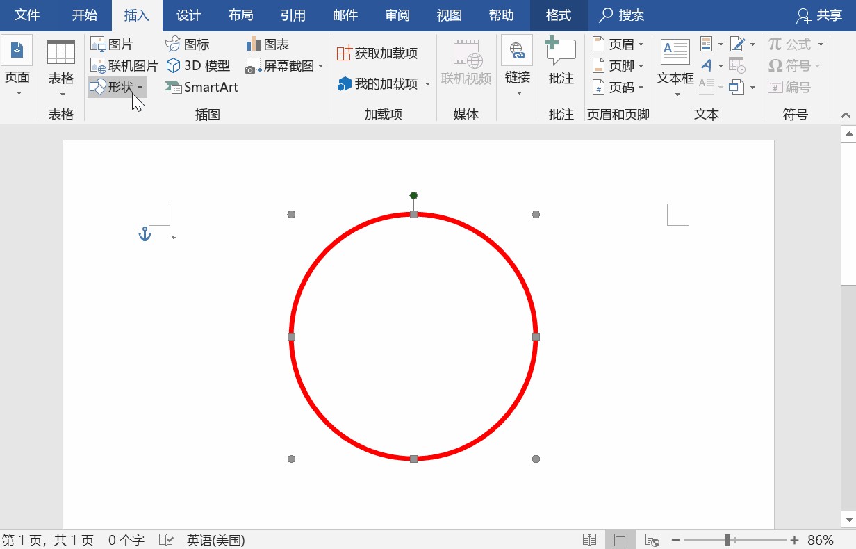 首先我们在Word中点击【插入】——【形状】——【椭圆】,绘制的时候按住【Shift键】可以绘制正圆,然后我们点击【填充】——【无填充】,【轮廓】——【红色】,线条的【磅数】可以自定~