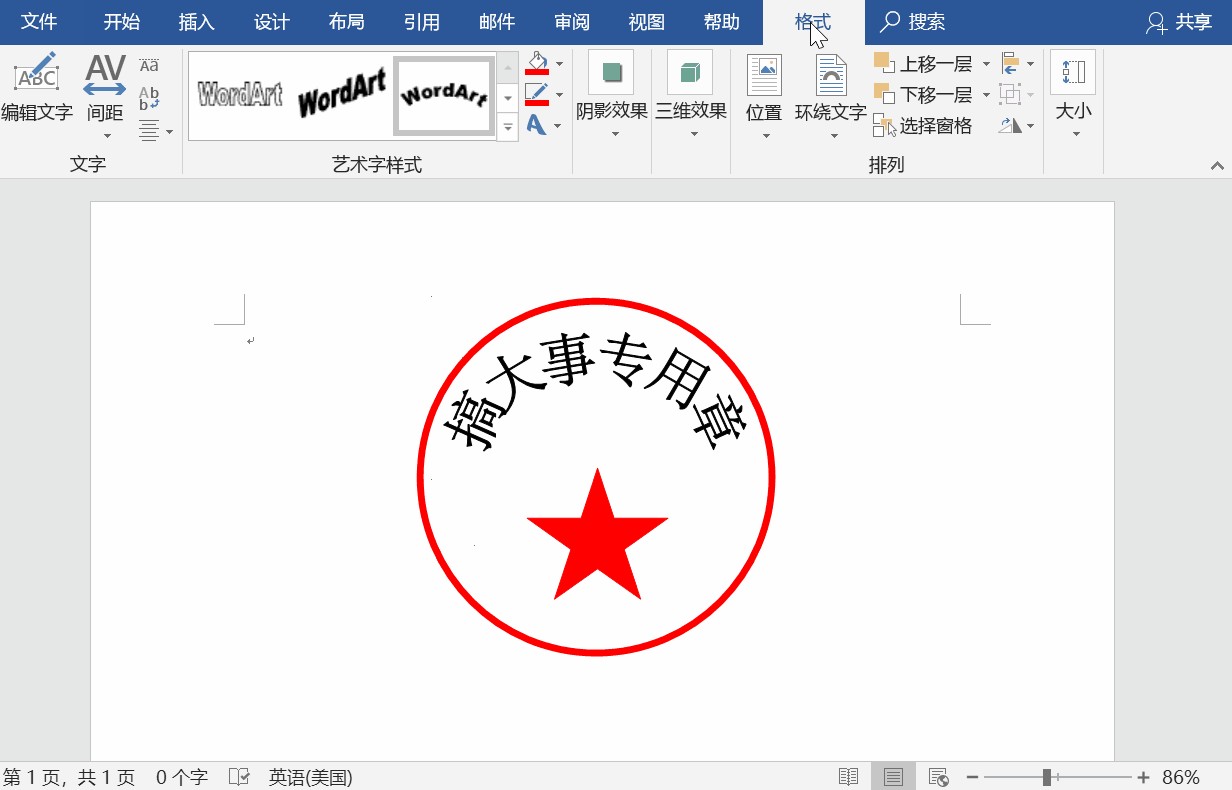 调整一下星星和文字的位置,也可以在下方载插入一个文本框,最后得到这样的印章~