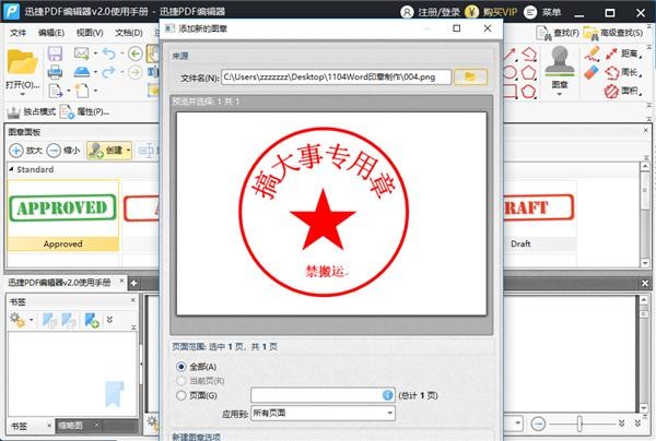 接下来我们选择应用范围,创建【新图章集】,点击确定我们就可以在图章调板看到我们的图章了~点击它,再放到我们的PDF文件里就可以啦!