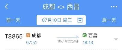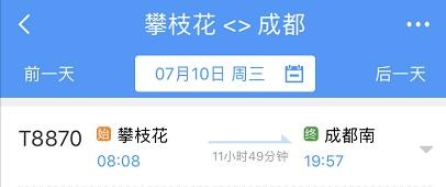 7月10日,T8870(攀枝花-成都)从攀枝花始发时间为8时8分,到达西昌为10时57分,终到成都南为19时57分。