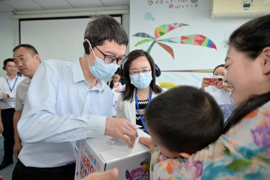 9月28日上午,中国红十字基金会名誉会长王海京、《公益时报》社社长赵冠军、中共湖北省委社会工作部二级巡视员朱红、湖北省卫生健康委员会二级巡视员江中三、湖北省红十字会秘书长陈波、武汉儿童医院党委副书记、纪委书记邓志宏等一行探望了在武汉儿童医院住院治疗的白血病患儿和康复中心的患儿,并为他们送上了英雄能量包,带去节日问候。