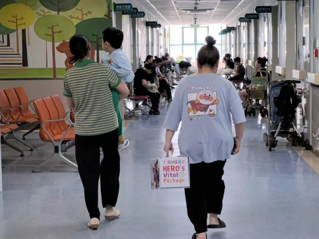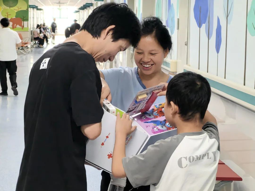 ▲康复中心的孩子拿到能量包后特别欣喜,在走廊上迫不及待地开箱