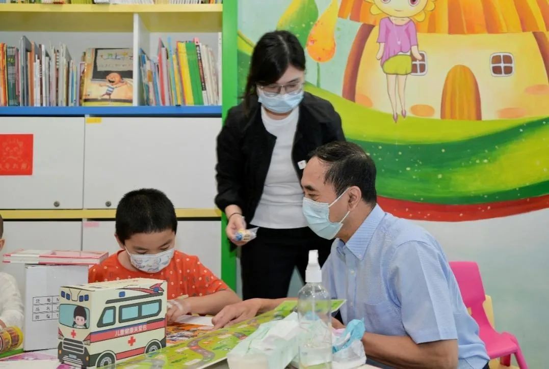 ▲中国红十字基金会名誉会长王海京为康复中心的患儿送上英雄能量包