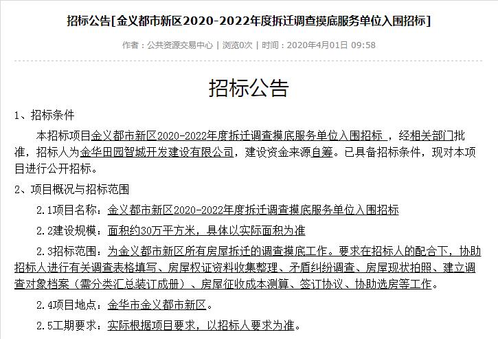 4月1日,金华公共交通中心公布了金义都市新区2020-2022年度拆迁调查摸底服务单位入围招标的招标公告。根据公告,此次拆迁调查摸底范围面积约30万平方米,为金义都市新区范围内的所有房屋进行拆迁摸底调查。