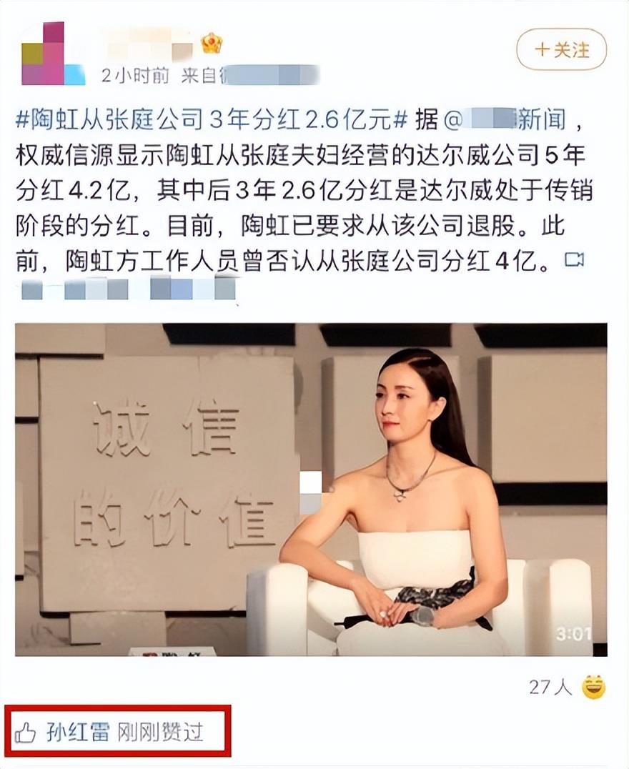 孙红雷可真是走在吃瓜第一线,这边官媒刚公布陶虹卷入张庭林瑞阳事件,那边他“不小心”的一个点赞帮大家更加注意到这个瓜。