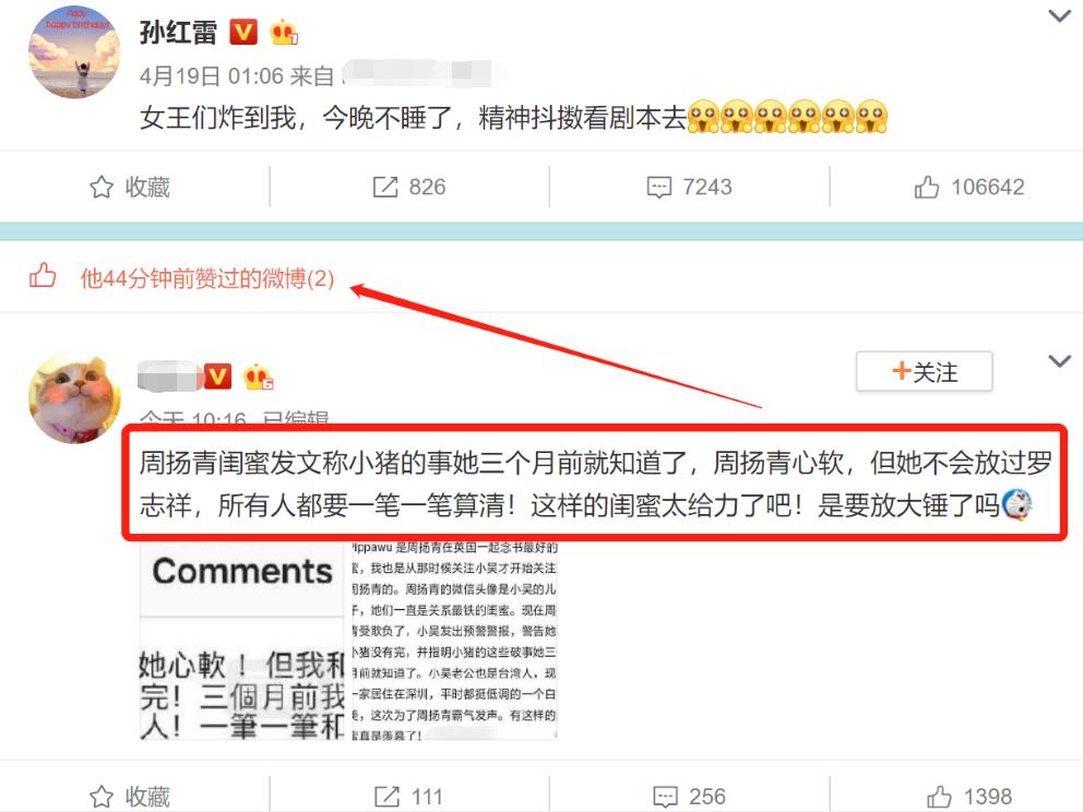咱们红雷哥上一次手滑点赞还是在周扬青控诉罗志祥的事件里,关键他点赞的还不是挺自家兄弟的,而是diss兄弟太渣的。