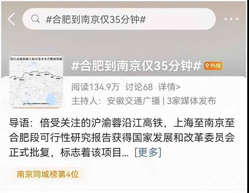 又一高铁正式获批,意味着南京至合肥交通升级,通勤时间将近一步缩短。“合肥到南京仅35分钟”更是直接冲上了微博热搜,引发网友热议。