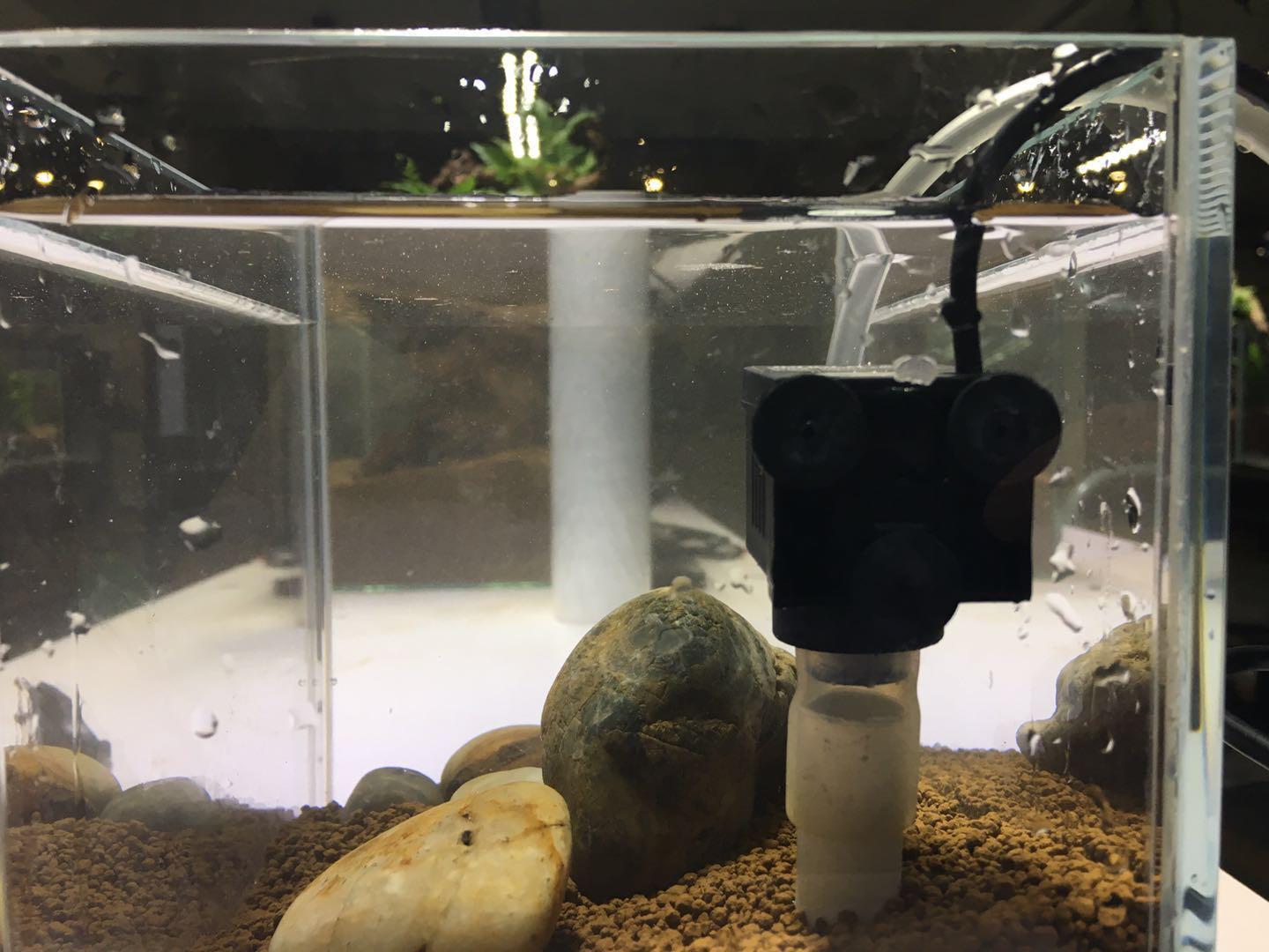 2、将改造连接好的水泵吸附在缸壁上(注意水泵吸盘沾点水,吸的更牢)