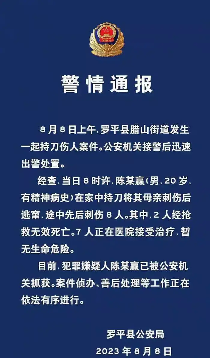 经调查,8月8日上午,犯罪人陈某赢(男,二十岁,有精神病史)在家中持刀刺杀母亲,随后逃窜出家门当街沿途行凶。先后刺伤了八人。