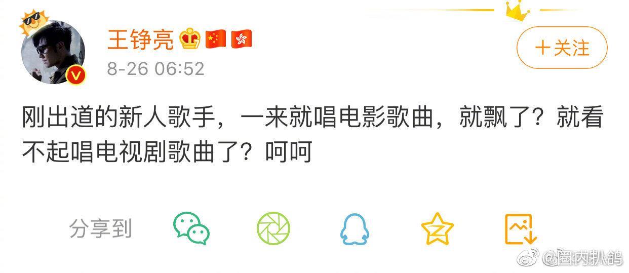 今早,王铮亮在微博上发文吐槽新人歌手,称:刚出道的新人歌手,一来就唱电影歌曲,就飘了?看不起唱电视剧歌曲了?呵呵