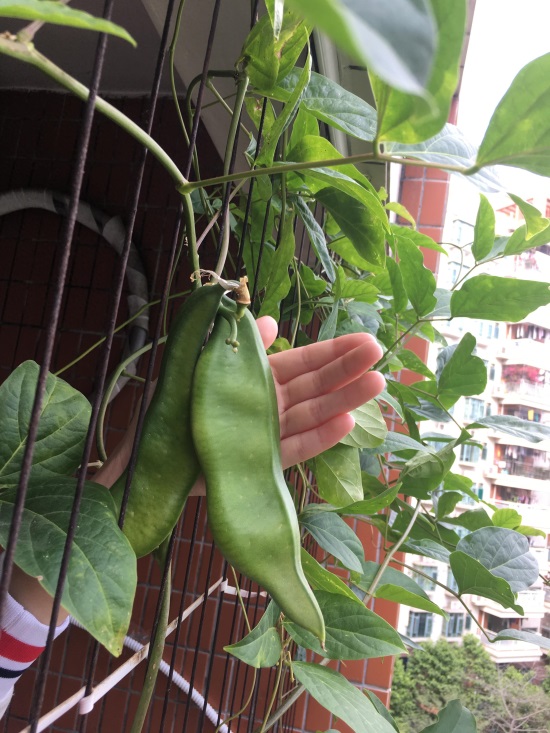 花谢后,开始结出豆荚。 看,这是一个月后的豆荚,竟然比一个手掌还长。