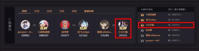“少女已熟”,以24万荣耀值获得小组第三,拿下3分