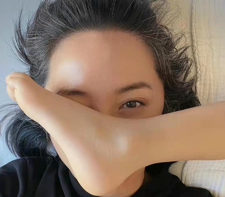在这张照片里面,李佳穿着一条黑色的上衣,躺在床上,完全是一种素颜的状态,而旁边伸过来一只脚,这只脚就直接盖住了他的脸,而且他的脚看起来比他母亲的脸都大,这两个人一起同框,看起来画面让人觉得特别的搞笑,而李佳现在是44岁的年纪,已经长出了一些白色的头发,显得略有一些苍老和疲惫了,但陪伴儿子互动却甘之若饴。