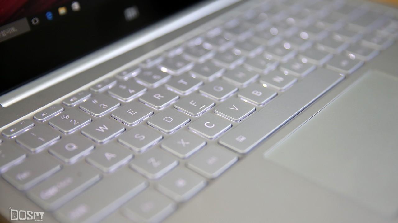 在键盘方面,小米笔记本Air 12.5"版本配备了一块全尺寸背光键盘,1.3mm键程,实际按压力度适中,回馈明显,打字体验十分舒适。值得一提的是,小米笔记本Air的键盘同样为银色设计,保证了整体的美观,而亮度为3nit 的背光等效果也十分理想。遗憾的是,键盘的背光灯只能开启或者关闭,无法调节亮度。
