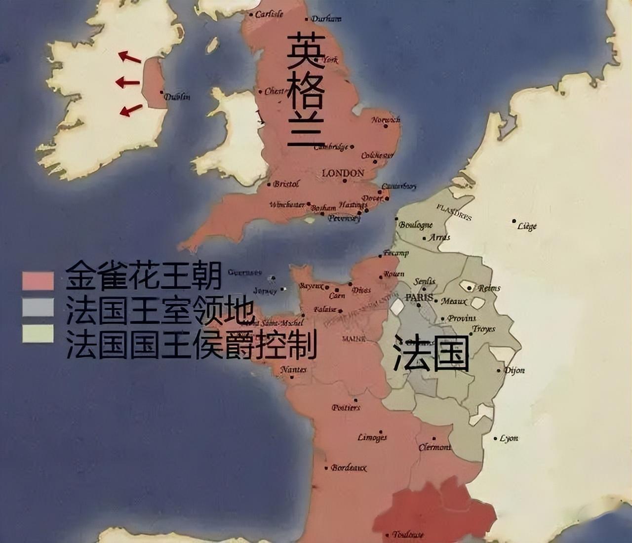 1152年,亨利二世迎娶了比自己大12岁的埃莉诺,将阿基坦公国收入囊中,此时的亨利二世坐拥阿基坦、诺曼底、安茹等地,其领地从罗亚河流域一直蔓延到比利牛斯山脉,成为法兰西领地面积最大的领主,远远超过了法国王室。法王路易七世对亨利二世迎娶埃莉诺懊悔不已,但为时已晚。