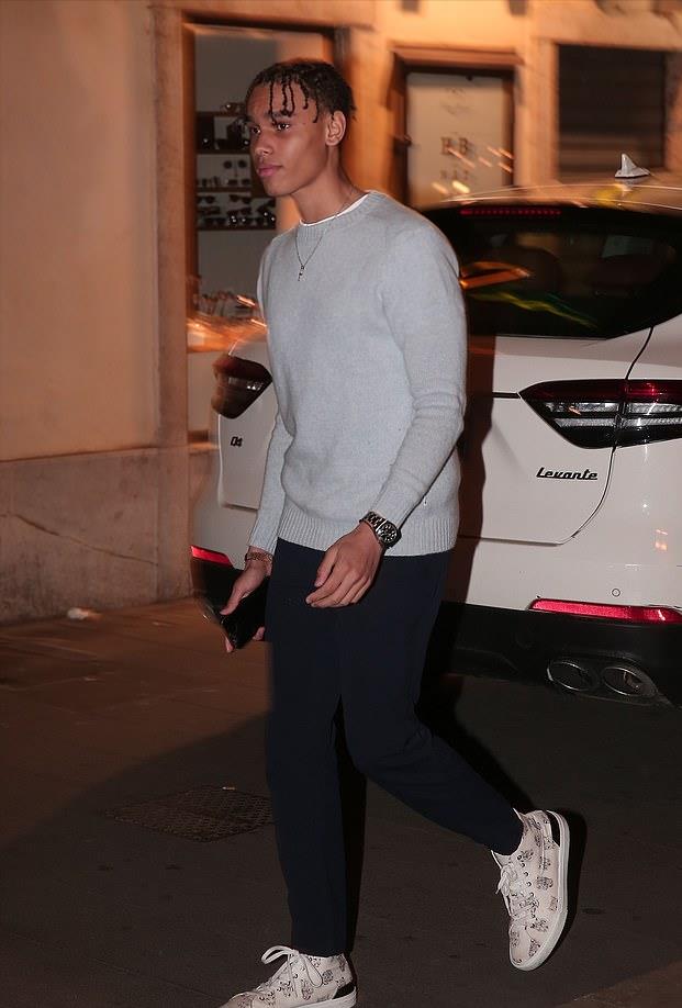 亚历山大看起来就是一个非常阳光的少年,这身造型也是非常时髦,灰色的毛衣配上小黑裤,涂鸦板鞋也是显得非常有活力感,虽然从小过着单亲的生活,但是看得出来这个被流落在民间的小王子心态非常健康。
