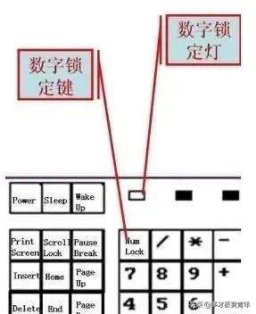 5.Num Lock叫数字锁定键,按一下,右侧第一个灯亮起来,这时数字键盘上的功能为数字功能,可以打数字。再按一下,灯灭了,这时变成控制区的功能,每个数字键上会印有对应控制区的英文说明。