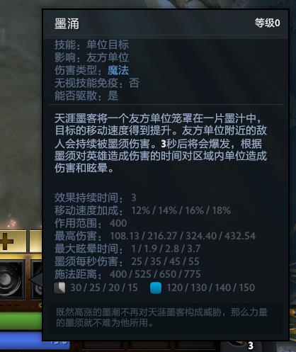 10级:大多数情况下我会选择30移动速度用来更好地在团战中生存或者找到更好的站位释放技能,因为100的墨涌最大伤害其实相对来说并不是那么重要(多怀念以前的加钱天赋啊QAQ)。