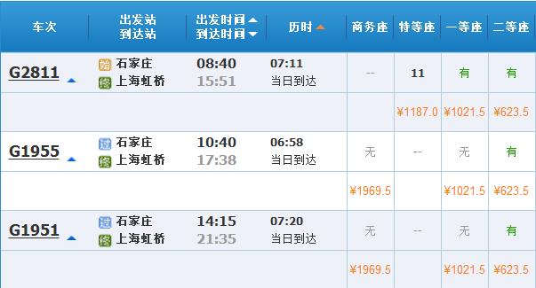 12306客服人员:“给我们的通知是两趟,但具体时间没有,肯定比普通车要快很多。按照北京到上海的距离,大概是5个多小时,石家庄到上海可能要慢一些,大概有6、7个小时。”由此估算,石家庄到上海的车程至少将缩短近10个小时。