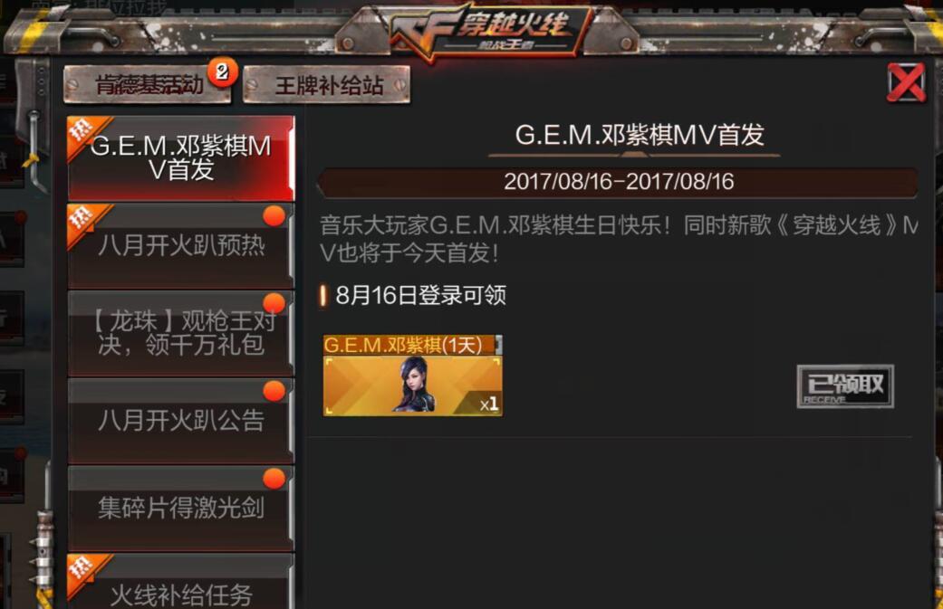 网友刚刚登录CF手游的时候,系统就提示有相应活动礼品赠送。玩家点击进去的时候,系统提示8月16是邓紫棋的生日,并且邓紫棋的穿越火线MV也是今天首发的。还赠送了一个关于邓紫棋的角色!网友瞬间表示很感动!