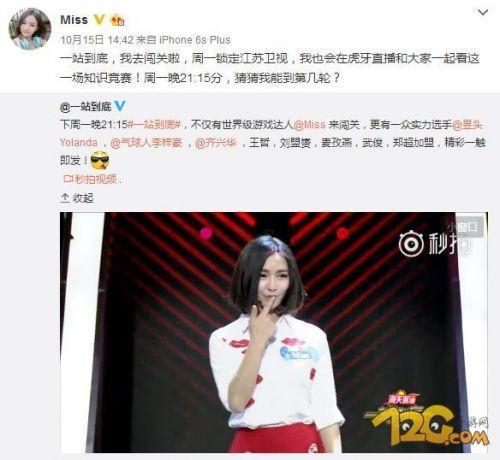 不少粉丝们纷纷到Miss微博留言询问真相,而Miss本人也终于在近日证实了自己参加“一站到底”的传闻,据Miss称,在17号节目就会证实与观众们见面啦,到时大家就可以好好欣赏LOL圈实力主播的智力程度啦。