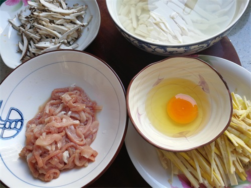 1.瘦肉,香菇,细笋切丝,鸡蛋打散;豆腐切丝后用清水泡着。另用玉米淀粉加水兑个芡汁备用。