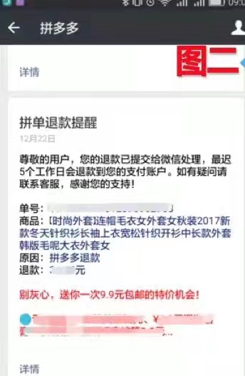 4、 提交申请后还可以修改申请,不要求退款也可以的。手机微信会收到一条拼单退款信息(如图二)