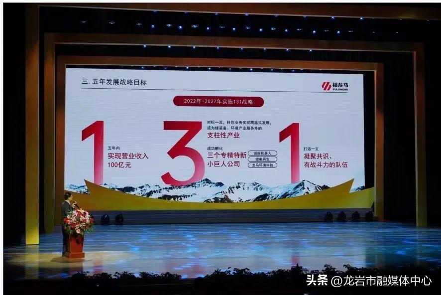 活动当日上午,福龙马集团举行品牌战略升级发布会,正式发布品牌新形象、新战略、城服机器人新业务和龙马环境生态体系等,计划在2022年-2027年实施“131战略”,即在五年内实现年营业收入100亿元;科创业务实现跨越式发展,成为继装备、环境产业服务外的支柱性产业,成功孵化城服机器人、锂电再生利用、龙马环境科技三个专精特新小巨人公司等。