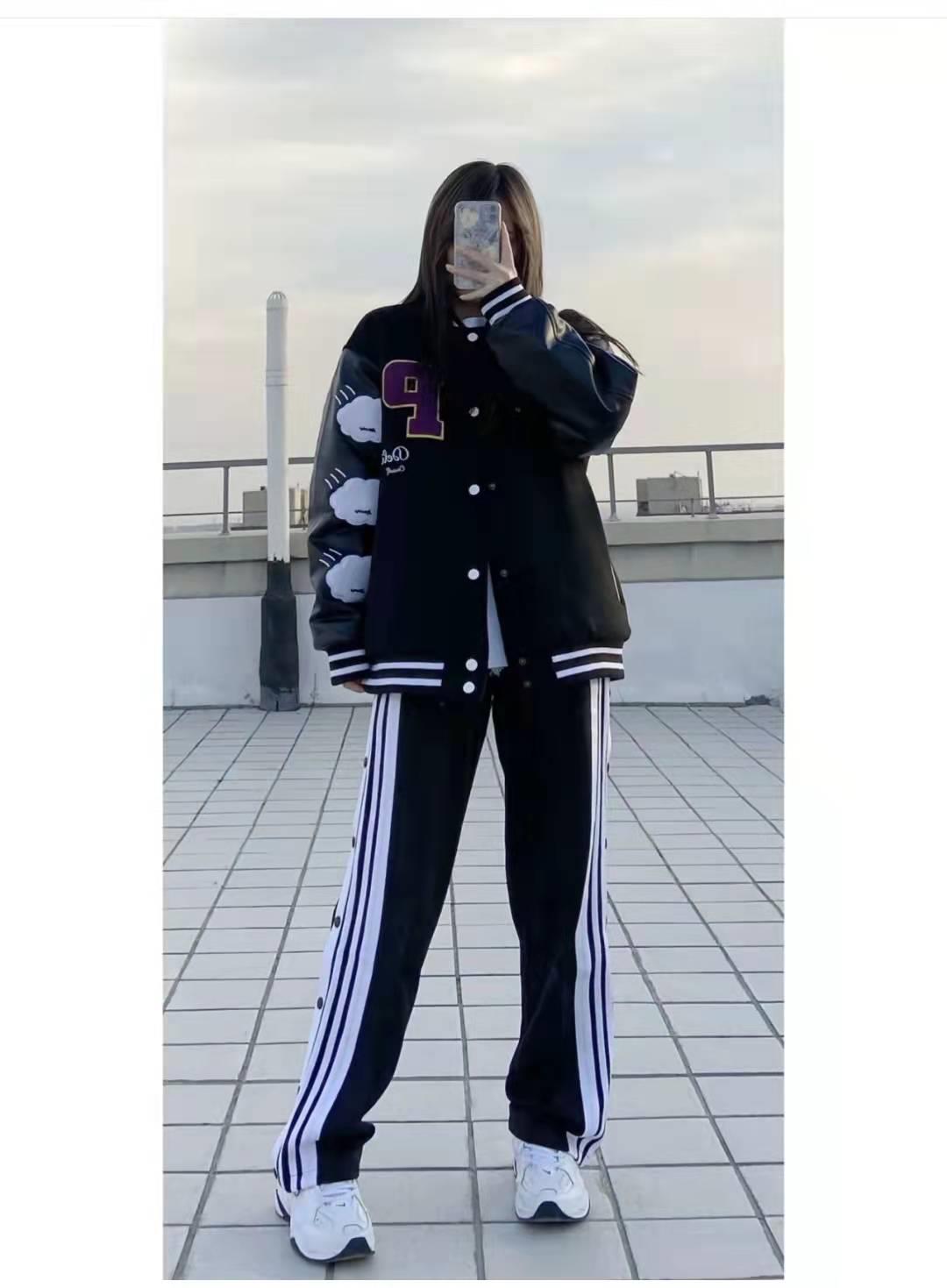棒球服穿搭:这件棒球外套太酷了,背面带印花街头味很浓,内搭白色T恤自然露出边角,下半身的拉链串标运动裤可以把拉链拉起来就是一条纯黑色运动裤,一裤2穿,更喜欢露出串标打破沉闷。