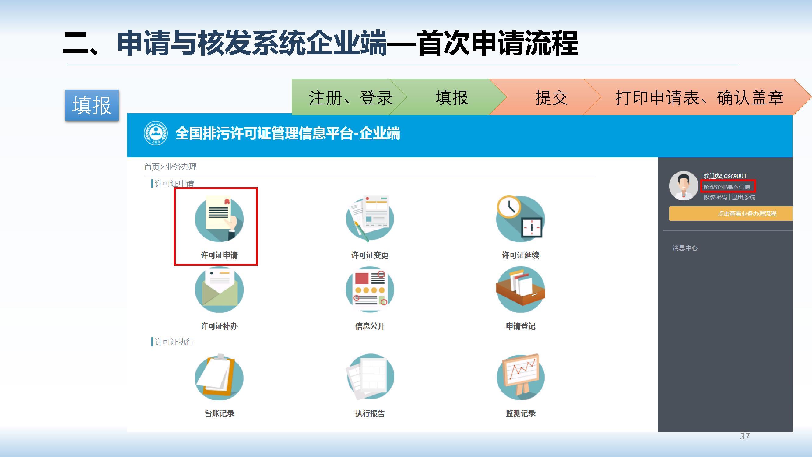其次,介绍了企业端的一些特点。包括企业端的基本操作、申请流程等。考虑到企业大多数均是首次在全国排污许可证管理系统中申请,所以多数申请为首次申请。 填报包括排污单位基本情况、主要产品及产能、排污节点集污染治理设施、排放口等等十几项子填报项目。
