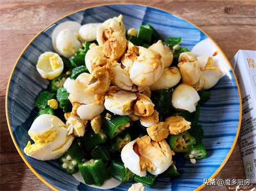 鹌鹑蛋提前煮熟,压扁,秋葵煮熟,去头尾,切小段,把鹌鹑蛋放在上面,淋上生抽酱油即可食用。这道家常菜简单易做,清爽可口,是我喜欢的口味。
